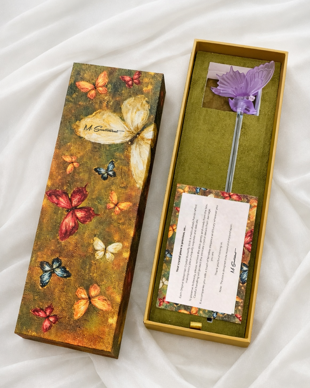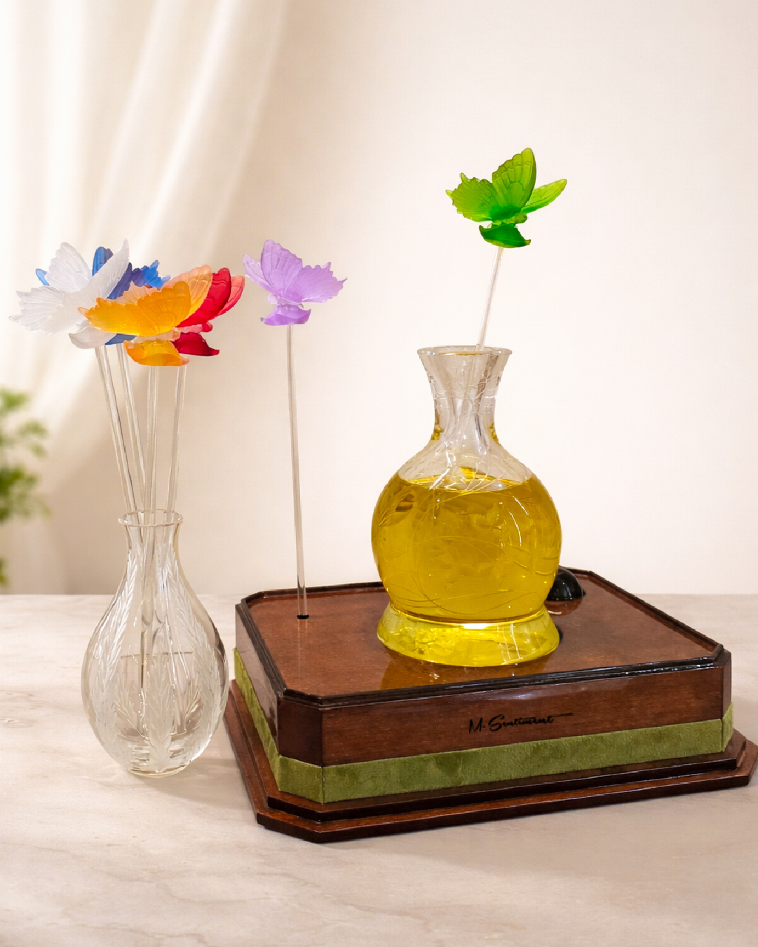 A symbol of Elegance and artistry, the butterfly vessel is more than a fragrance accessory. It is a statement piece designed to elevate your occasions and bring timeless beauty to your favorite corners. Handmade from original Bohemian Crystal and delicately engraved with a butterfly theme, it reflects sophistication, craftsmanship and enduring charm.